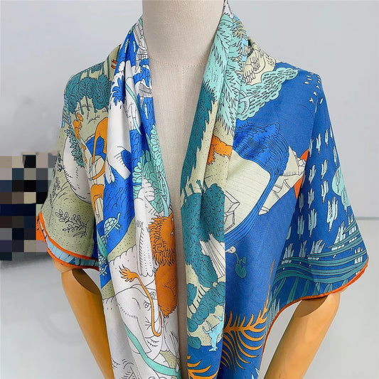 135CM Silk Cashmere Scarf Women Hand Rolled Shawls Jungle Animals Print Square Scarves Wraps Lady Bandana Hijabs Female Foulards