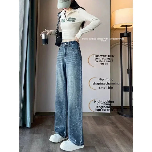 2024 New Spring Summer Women's Jeans High-waisted Loose-fit Sensibility Straight-leg Dragged Trousers Narrow Wide-leg Design