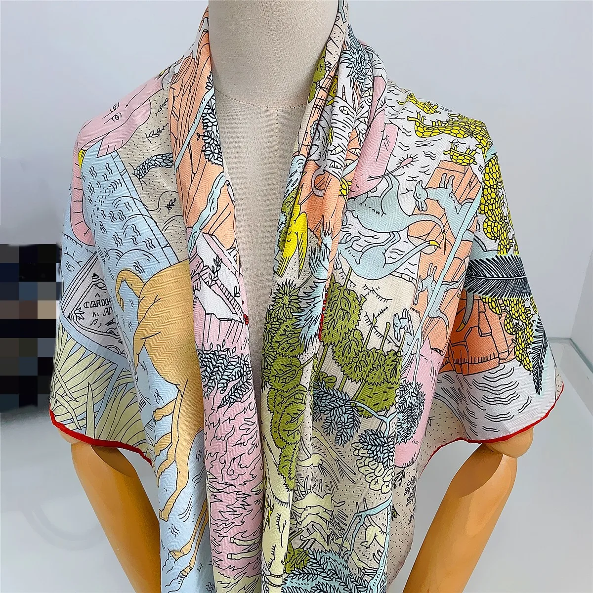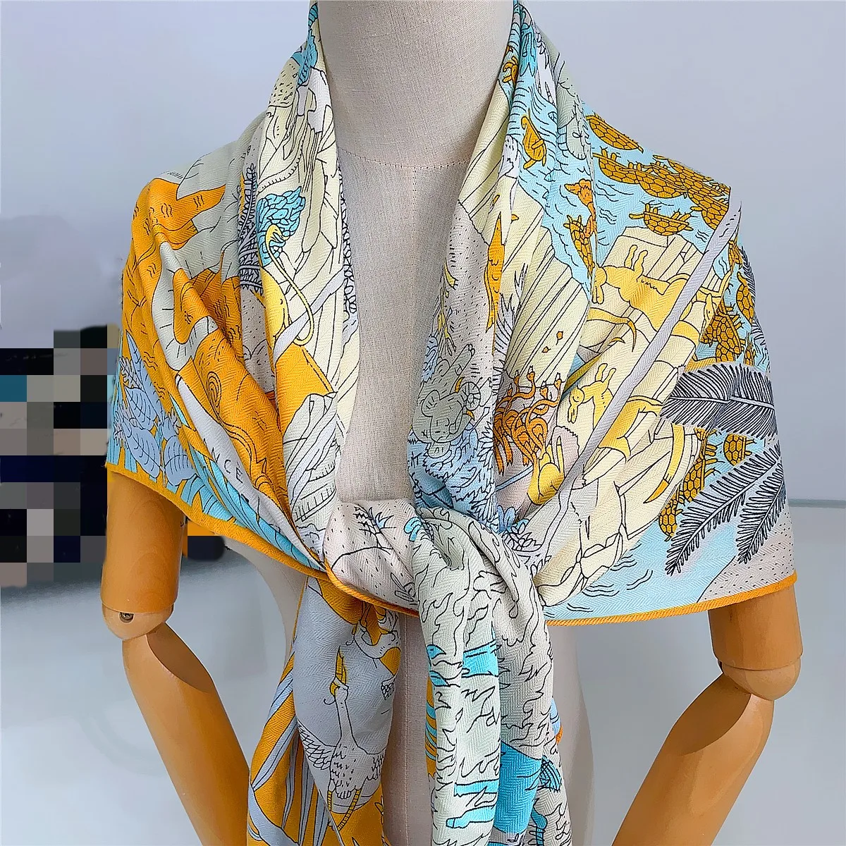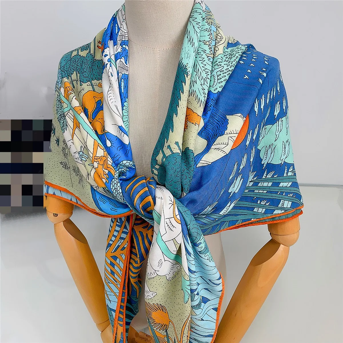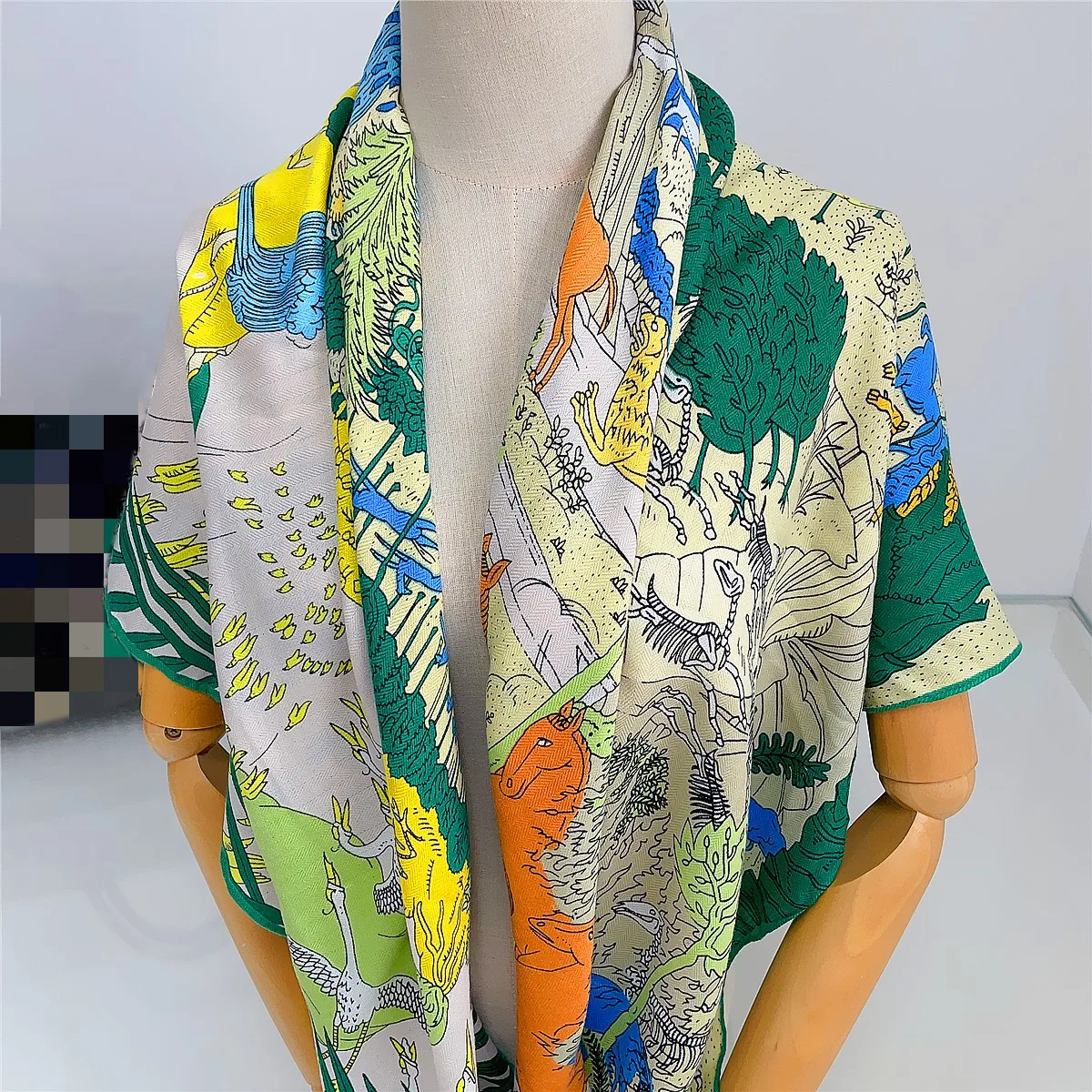 135CM Silk Cashmere Scarf Women Hand Rolled Shawls Jungle Animals Print Square Scarves Wraps Lady Bandana Hijabs Female Foulards
