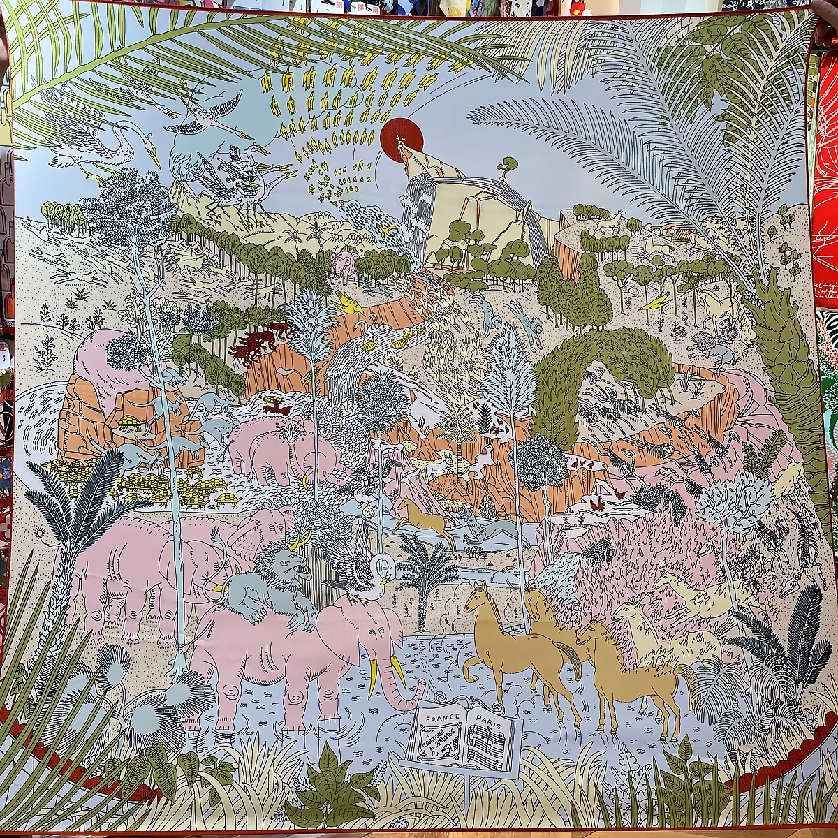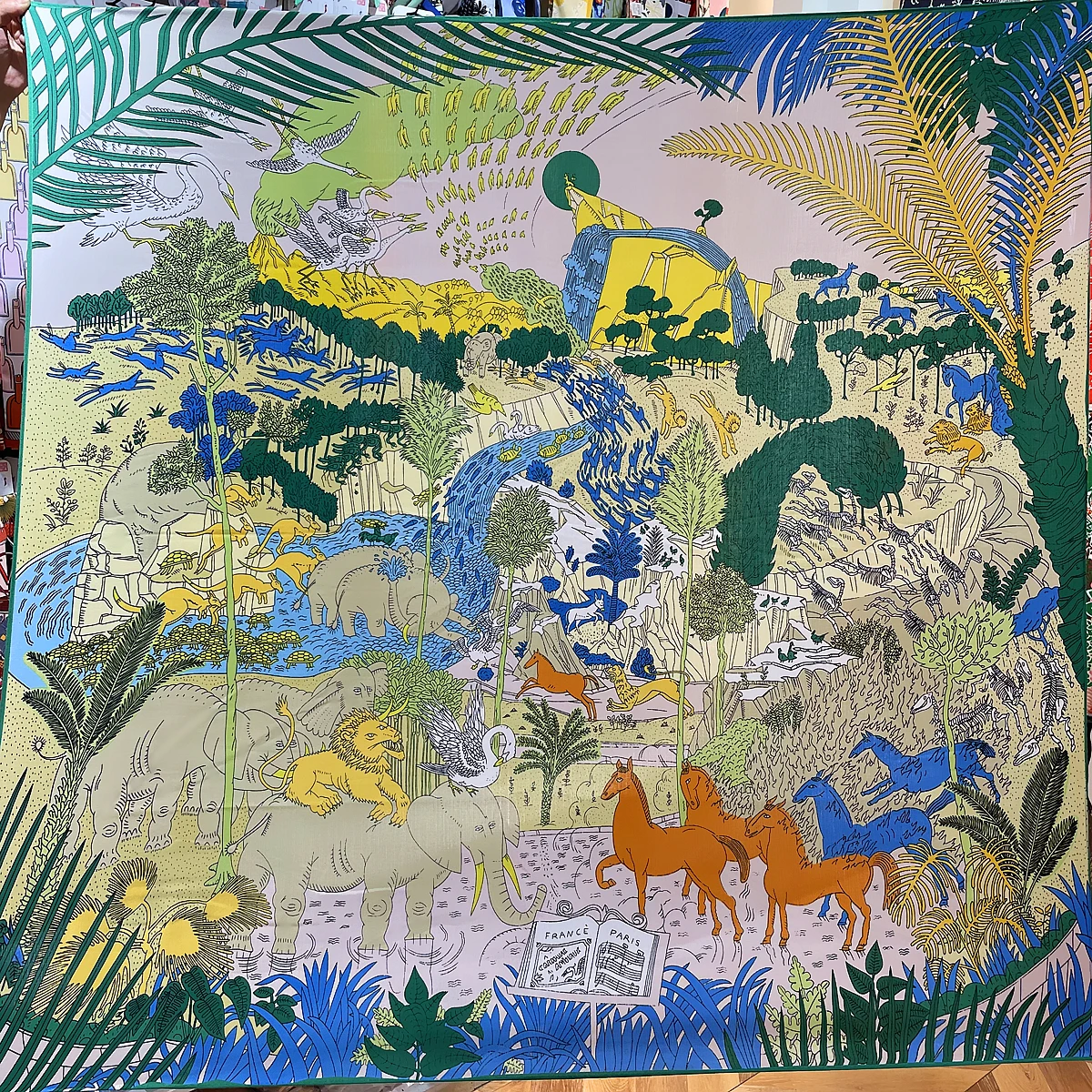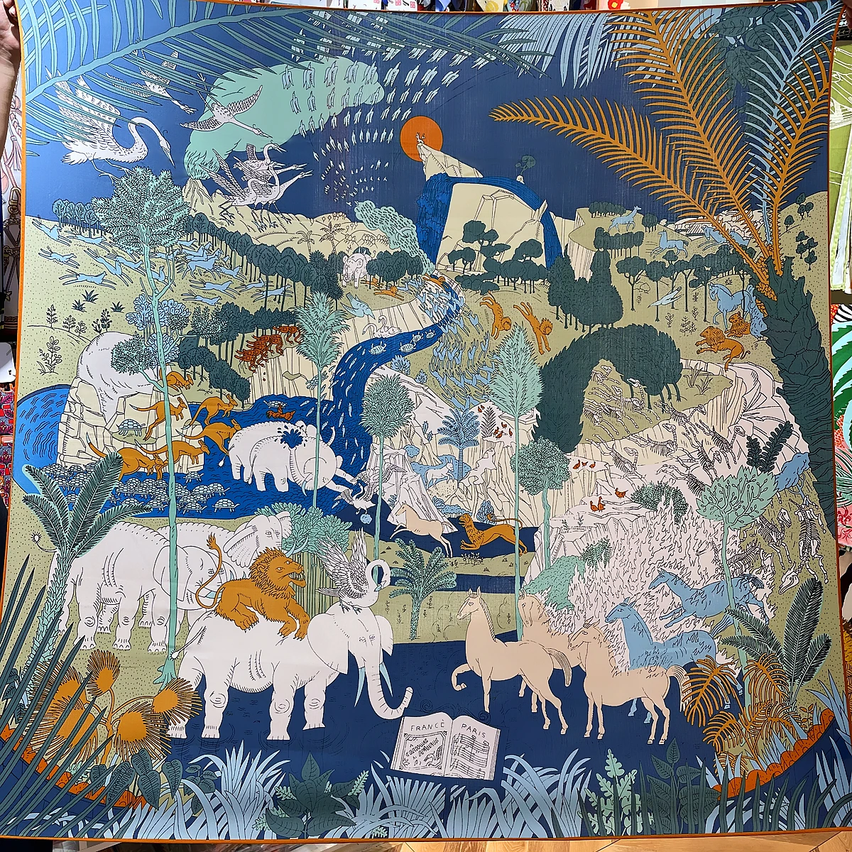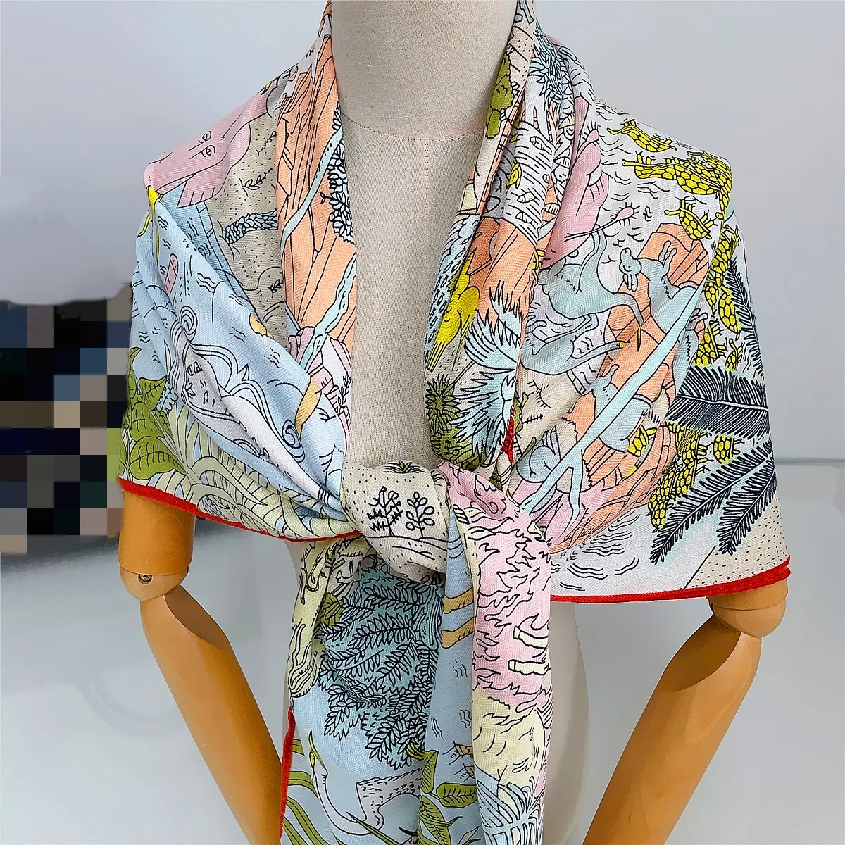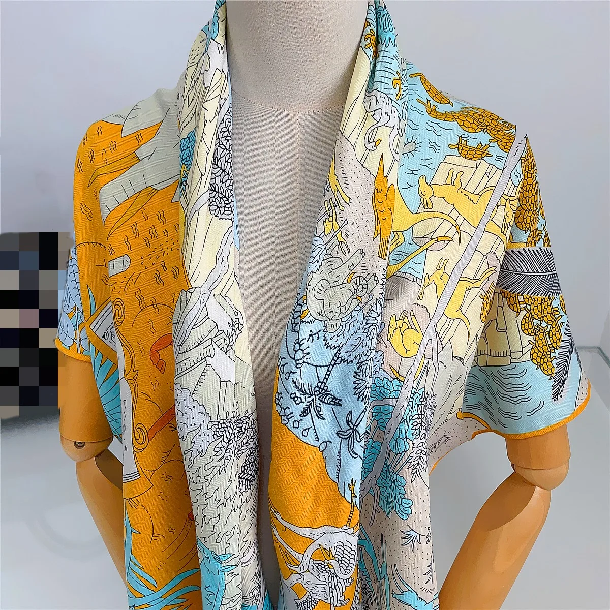 135CM Silk Cashmere Scarf Women Hand Rolled Shawls Jungle Animals Print Square Scarves Wraps Lady Bandana Hijabs Female Foulards