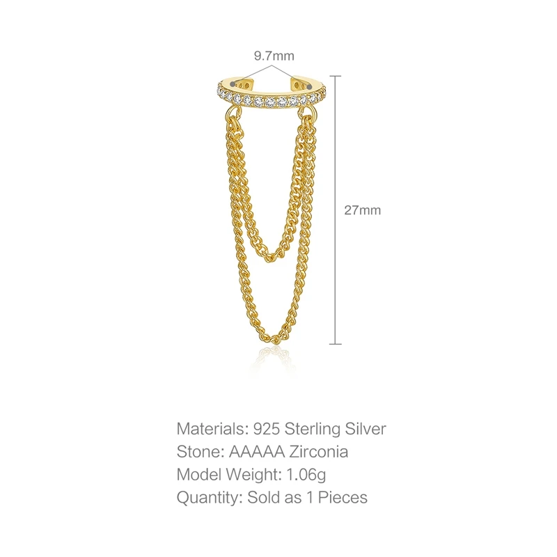 925 Sterling Silver White Zircons Pave Chain Tassel Ear Cuffs For Women Non Pierced Oval Crystal Crown Shape Clip Earrings