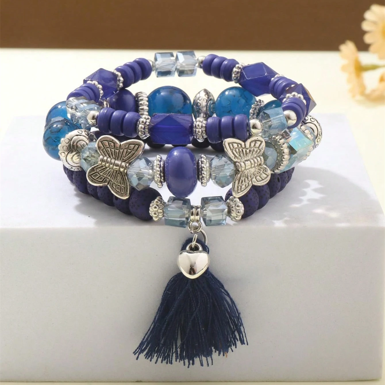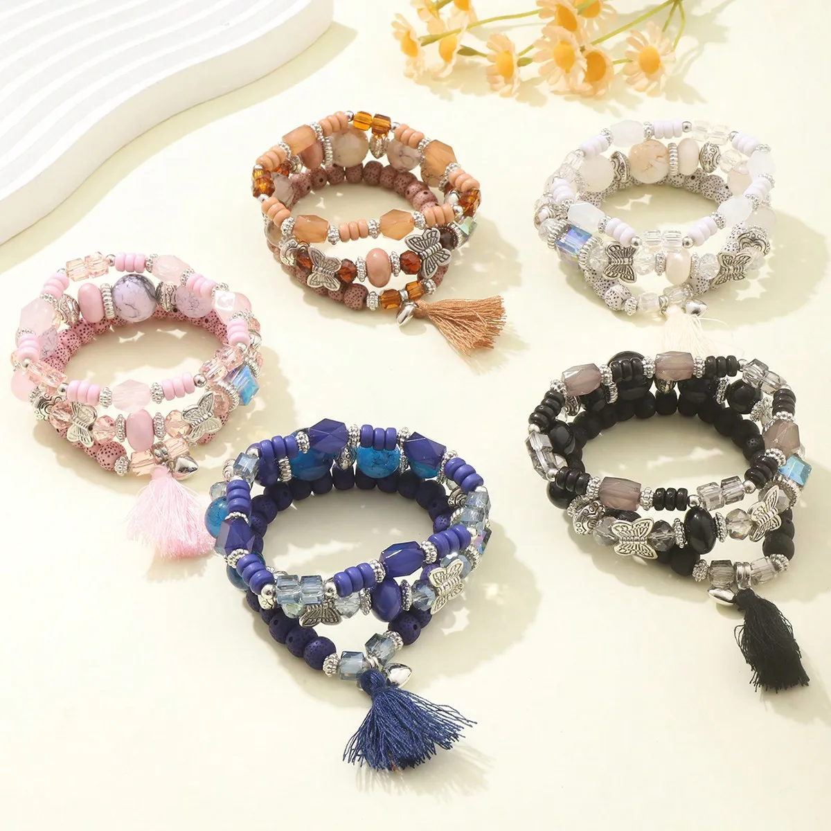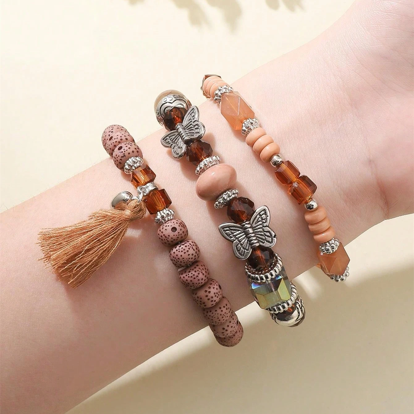 FTCY 3Pcs Women Boho Tassel Butterfly Bracelet Multicolor Volcanic Stone Natural Stone Elastic Cord Hand Chains Ethnic Jewelry