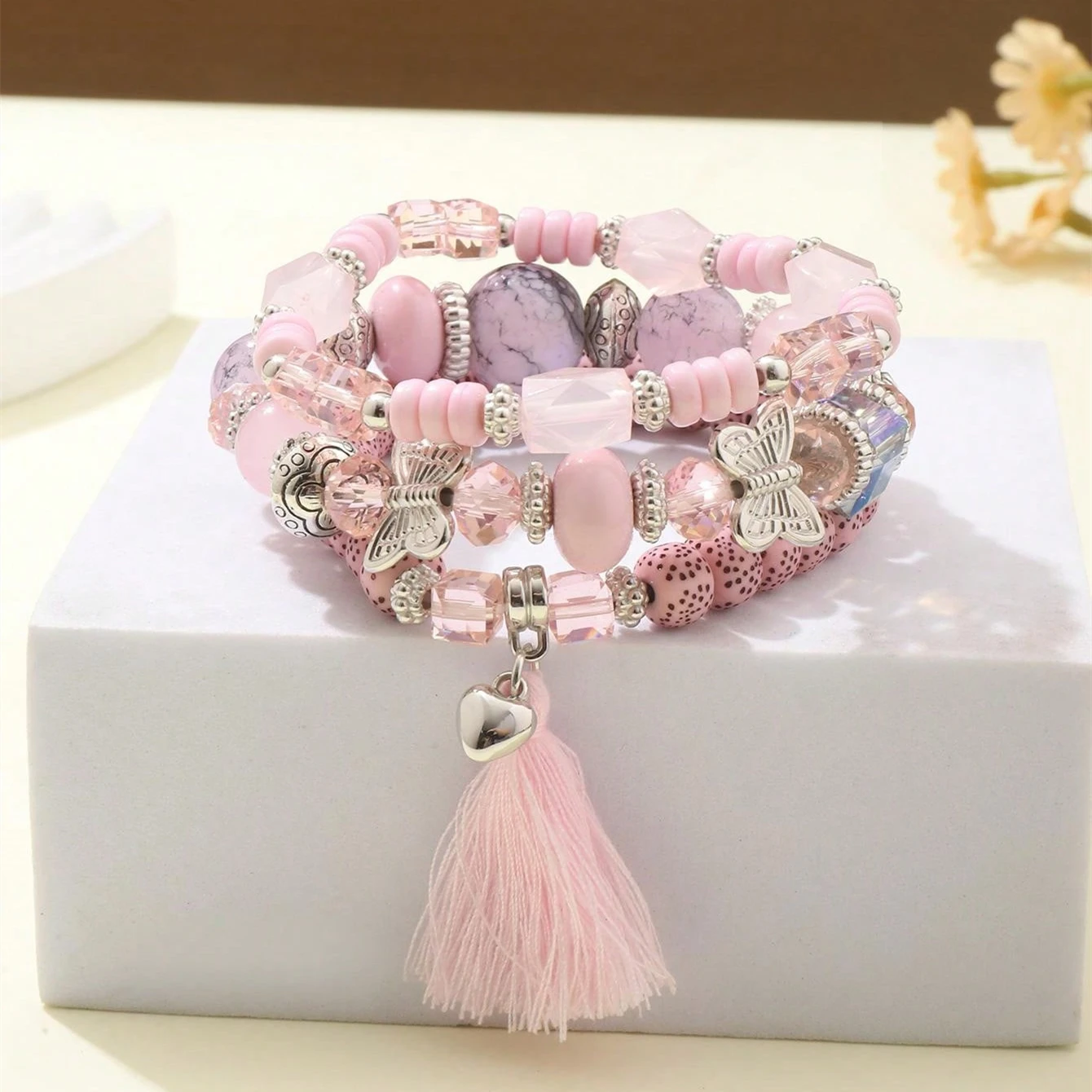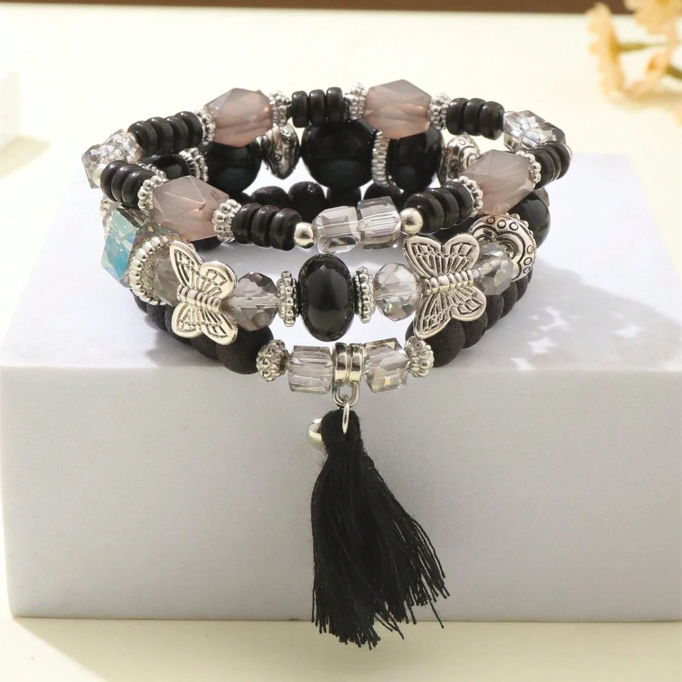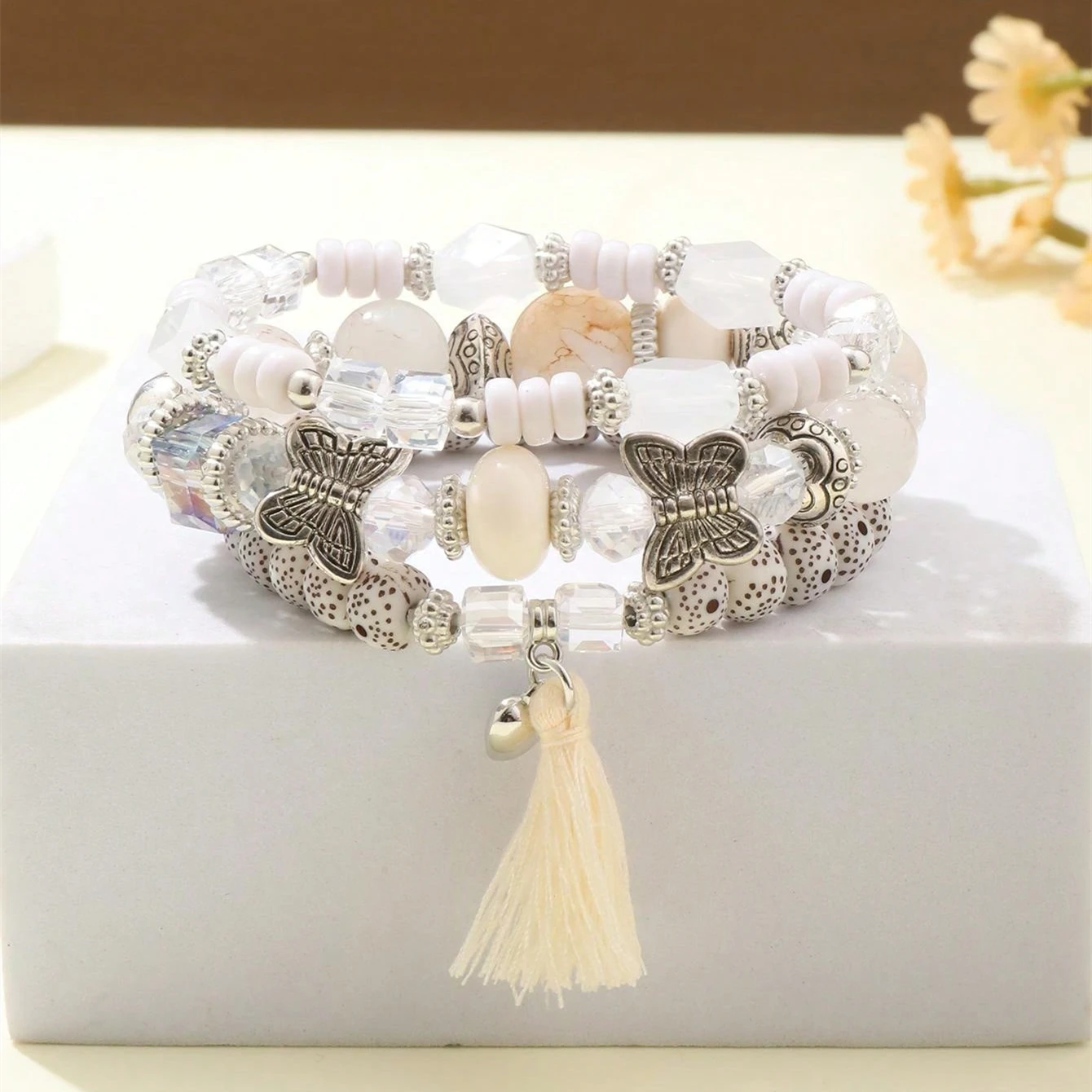 FTCY 3Pcs Women Boho Tassel Butterfly Bracelet Multicolor Volcanic Stone Natural Stone Elastic Cord Hand Chains Ethnic Jewelry