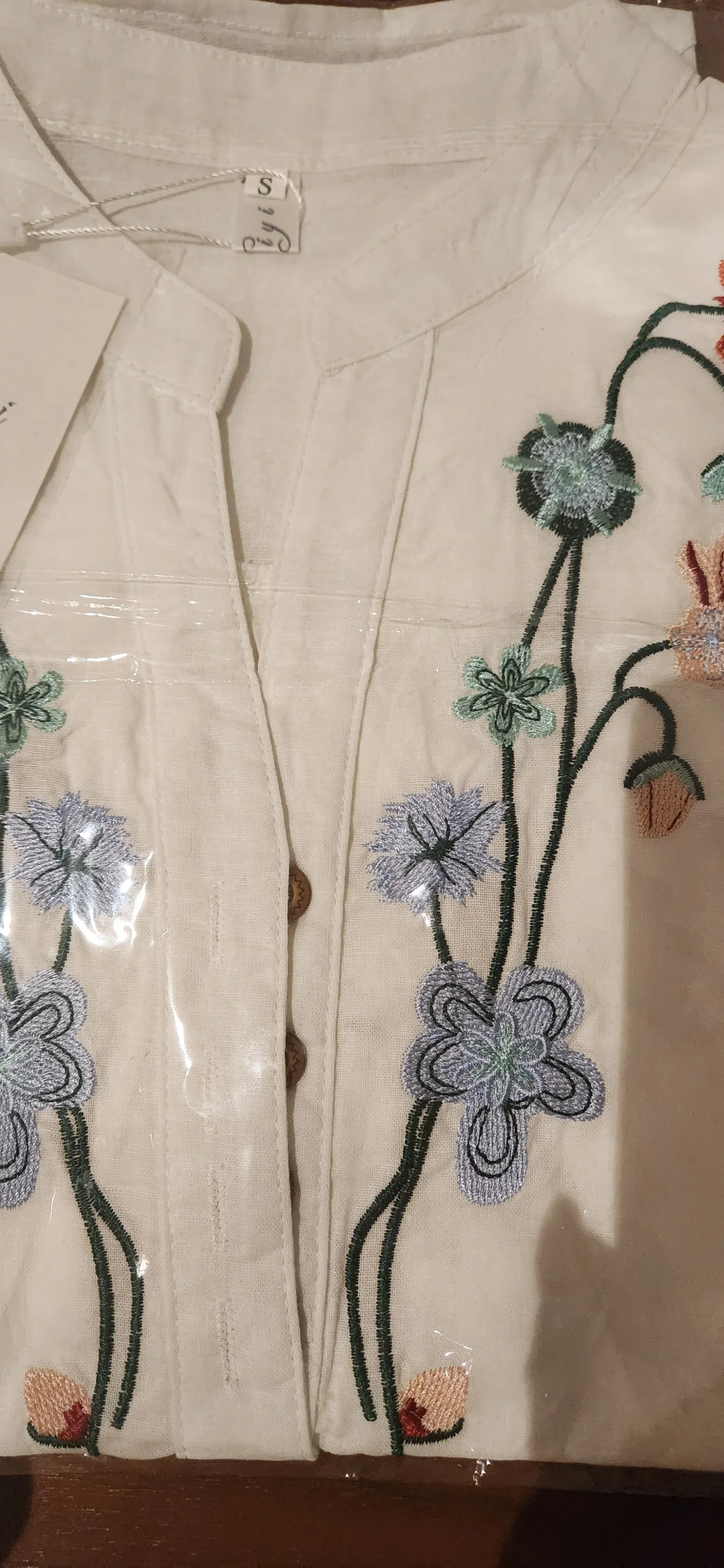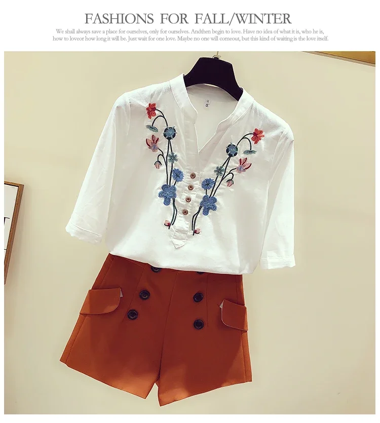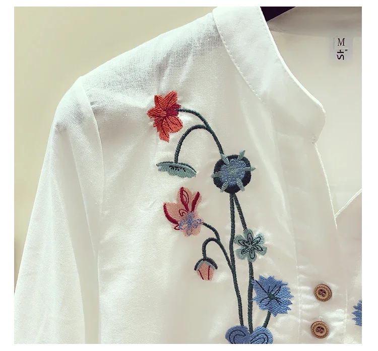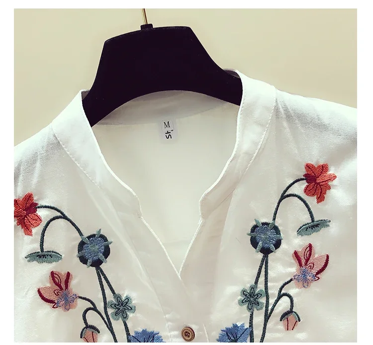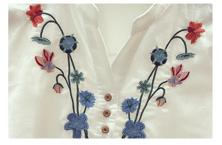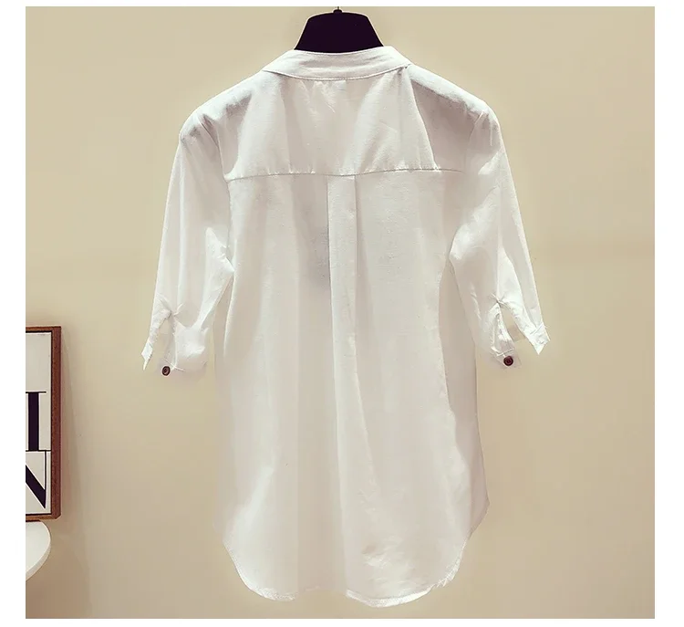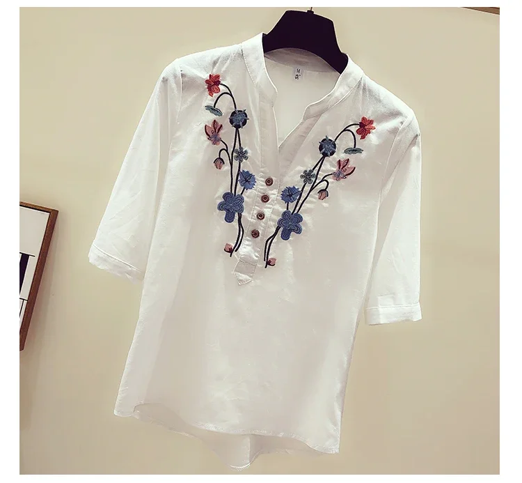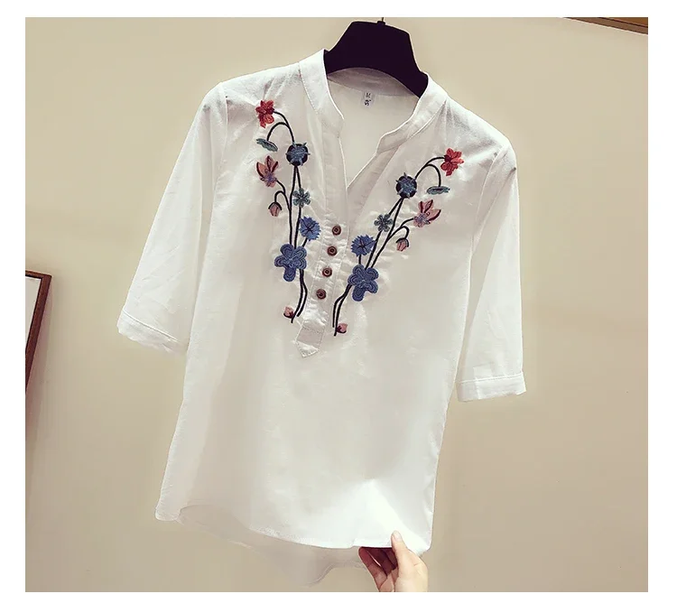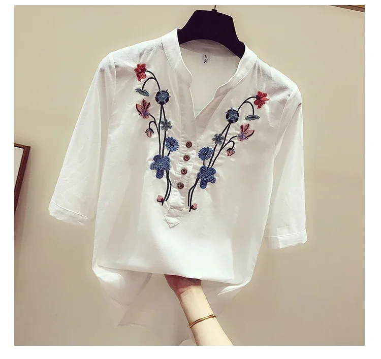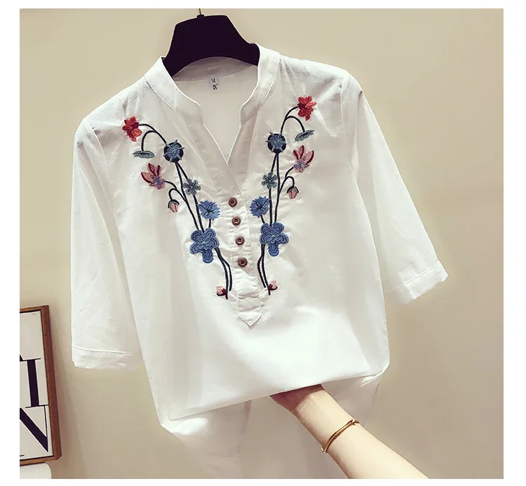 New V-Neck Shirts 2024 Summer Womens Clothes Loose women's Shirts Cotton White Blouse Elegant Embroidery Tops and Blouses 3140