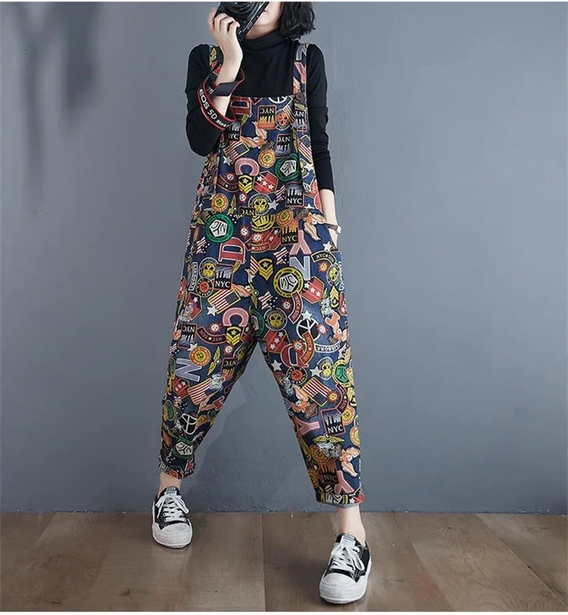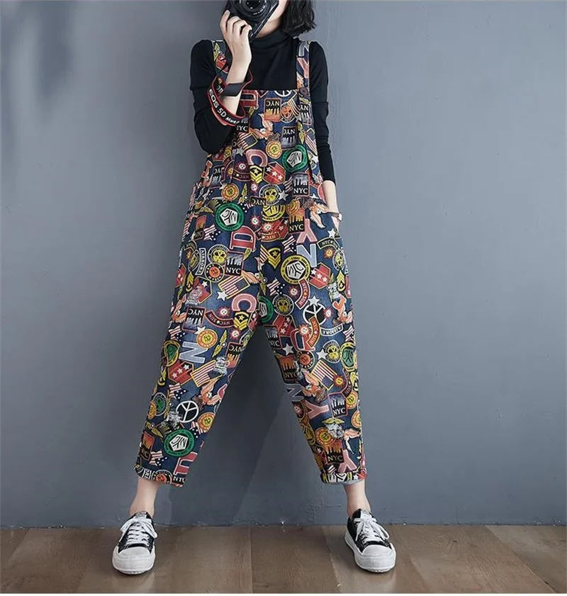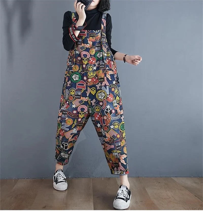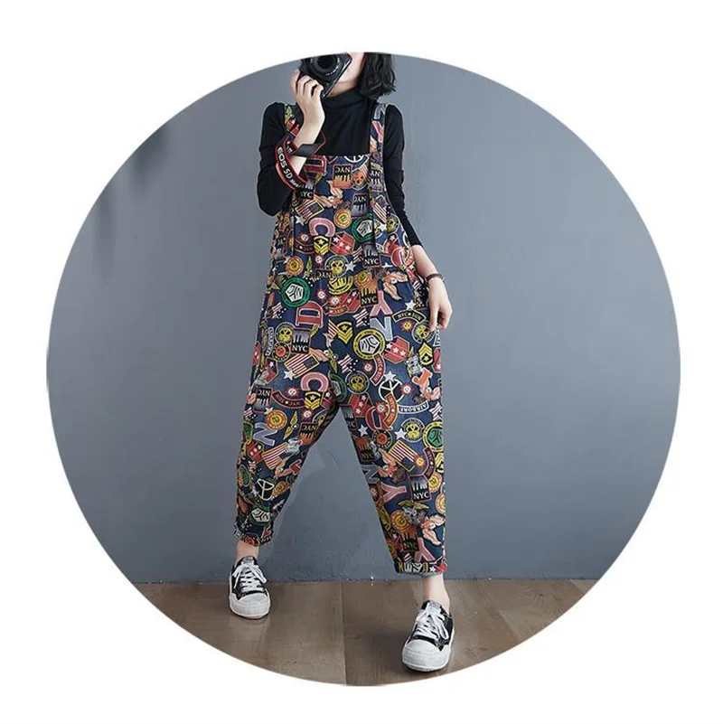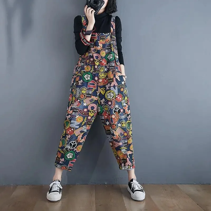 Printed Denim Strap Pants For Women's Jeans 2024 Spring Summer New High Waisted Versatile Loose Fitting Jumpsuit Female