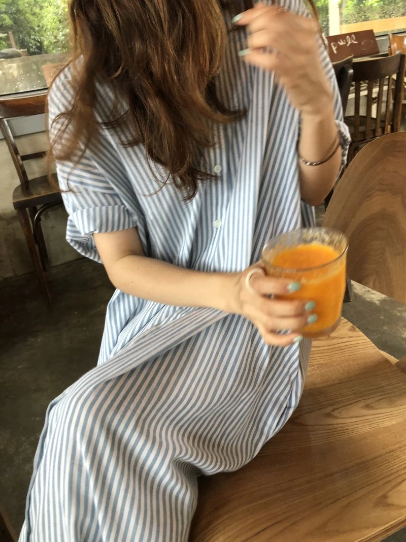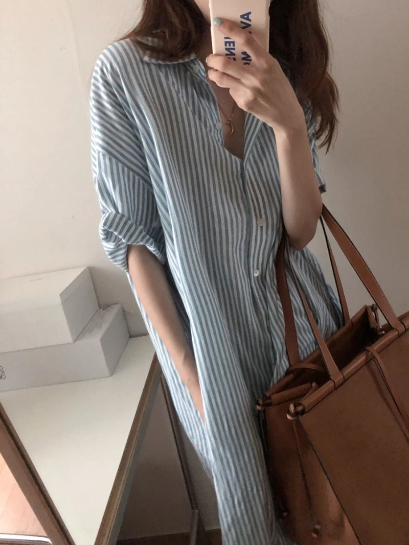 REALEFT Summer Vintage Striped Women's Shirts Dresses 2024 New Short Sleeve Single Breasted Casual Loose Long Dress Female